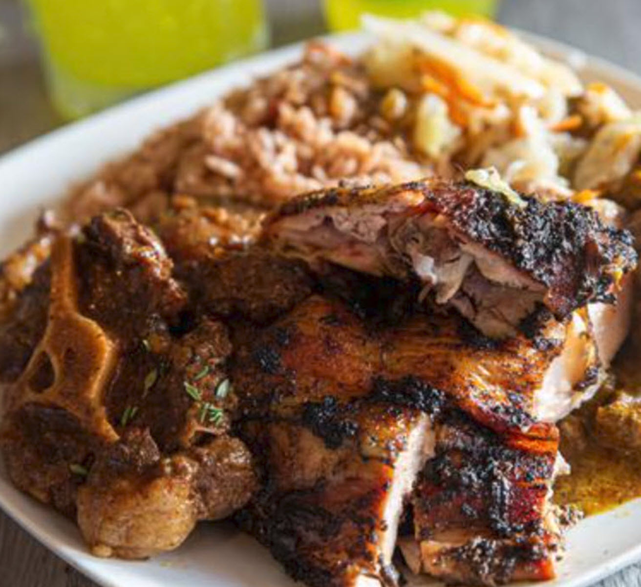 Triple Threat-Taste of Jamaica -Ox Tails, Jerk Chicken & Curry Goat + Slice of Cheesecake